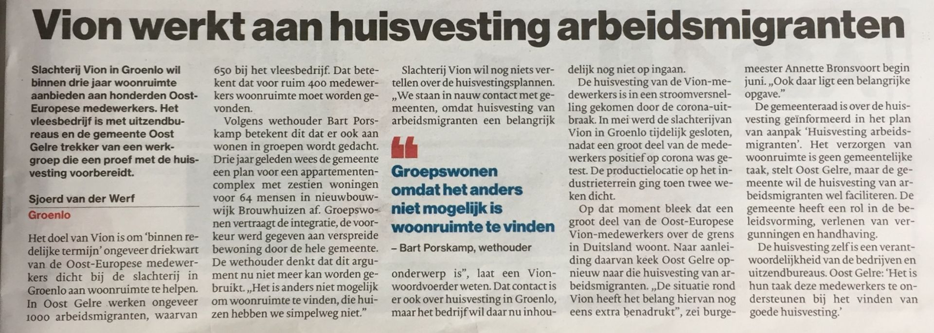 Nieuwbouw van aparte huisvesting voor arbeidsmigranten in Oost Gelre t.b.v. Vion is voor ons onbespreekbaar. Laagwaardig werk dient Vion wat OLW betreft te verplaatsen naar het buitenland, in plaats van uitbuiting van arbeidsimmigranten in Nederland en Duitsland.